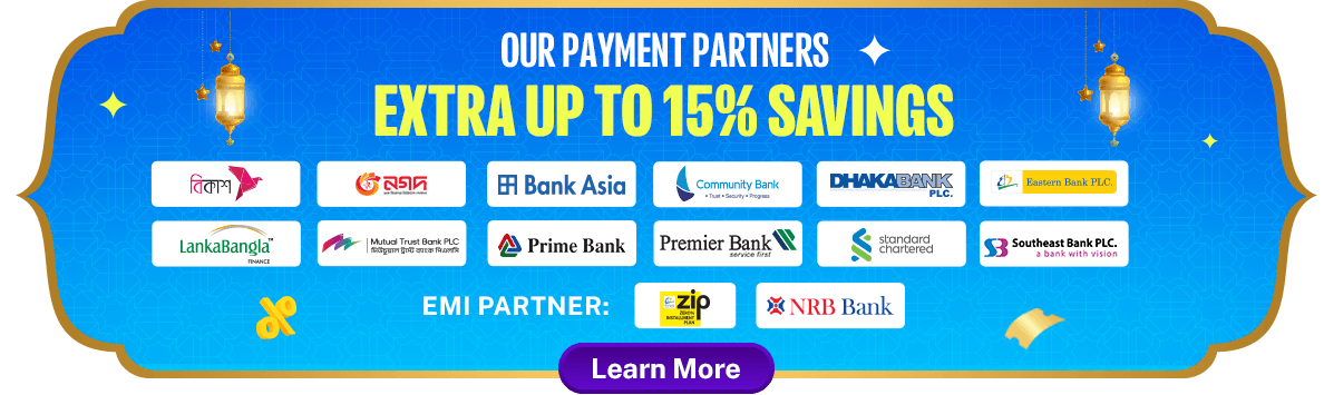 - Bkash, Nagad, Bank Payment, Debit/Credit Card, EMI (Zip, NRB Bank) ইত্যাদি।
